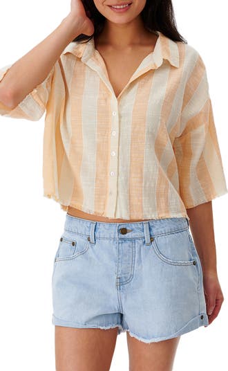 A boxy fit adds to the laid-back style of this lightweight cotton and linen shirt covered in pretty pastel stripes and framed by a frayed raw trim.