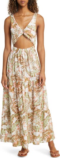 An airy cotton-blend lends a summery feel to this tiered maxi featuring shapely smocking at the bodice and a muted floral print.