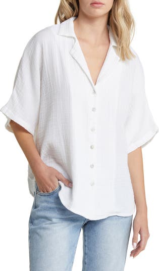 Double-gauze cotton is a soft delight when the temps are high in this billowy shirt framed by wide dolman sleeves.