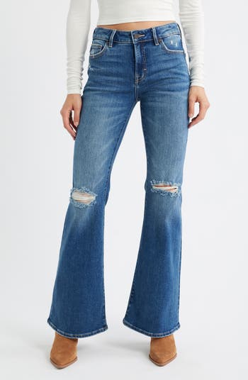 Threadbare rips and deep sanding amplify the lived-in appeal of stretch-enhanced denim jeans featured in a mid rise with stylishly flared hems.
