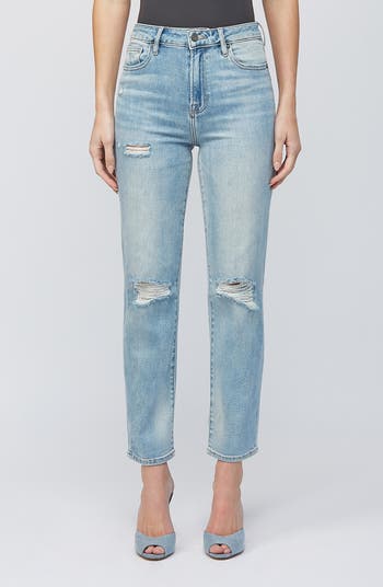 Threadbare rips create a cool worn-in look on these slim-cut straight-leg jeans made from light-wash stretch denim.