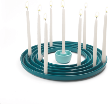 Six concentric aluminum rings ripple outward to hold the Hanukkah candles while the shamash sits separately at the center, allowing users to build their own candle arrangement. The circular form offers a fresh perspective on the menorah—modern and playful while still honoring tradition. Constructed from durable powder-coated aluminum, it’s designed to last for generations of celebrations.