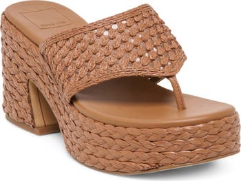 A bold block heel and platform sole bring height to this raffia sandal perfect for sunny days.