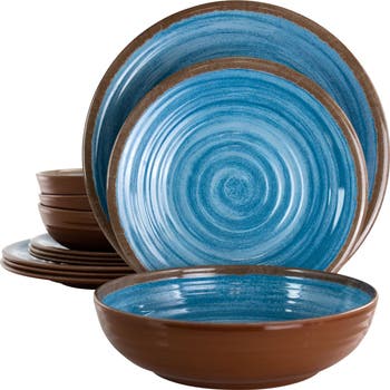 Guest will adore the ocean wave like styling of the Elama Rippled Tides 12 Piece Lightweight Melamine Dinnerware Set in Blue. Draw the crowd to the dinner table with blue ocean like swirls over a brown exterior that is featured in every dish. Made of lightweight melamine, these especially thin pieces can easily fit in most storage spaces. The light material is practically weightless while providing durable shatter resistant quality. For best care, the set is top rack dishwasher safe and is not microwave safe. Perfect for outdoor gatherings, kids parties, picnics or for casual daily activities.