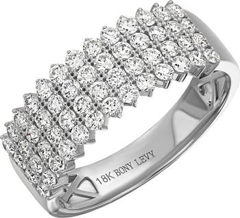 Three rows of 52 round diamonds sparkle atop a mesmerizing ring handcrafted from 18-karat white gold.