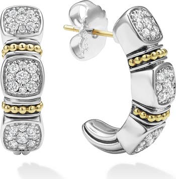 Square settings beaming with diamond pavé and signature Caviar beads ensure you shine in these hoop earrings crafted from sterling silver and 18-karat gold.
