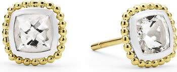 A sparkling white topaz is placed in a sterling silver setting and traced in 18-karat gold beading for a signature finish to these elegant stud earrings.