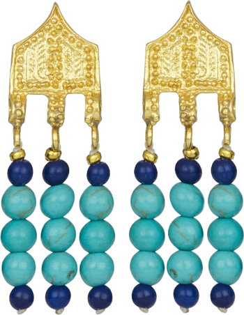 Hand crafted with 21ct gold-plated recycled brass, this statement earrings are set with turquoise and lapis beads held by a stunning gold design with carved finishing. We're sure these beaded earrings will be a summer jewelry box favorite.