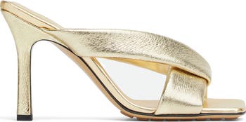 Crafted of metallic lambskin leather, padded, tubular straps in a twisted design bring a distinctive look to this Italian-made sandal framed with a square toe and tall heel. A rubber-injected leather sole enhances comfort and stability.
