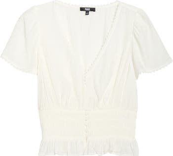Lightweight and softly textured, this short-sleeve top is cut from flowy dotted fabric. A deep V-neckline, decorative buttons and delicate lace trim add intricate detail, while smocking at the waist creates a flattering fit.