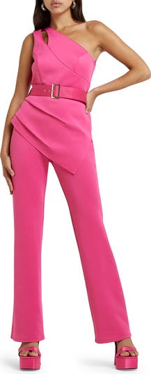 Glinting hardware lends luxe polish to a stretch-kissed jumpsuit accented with asymmetric pleats and a cutout on the strap.