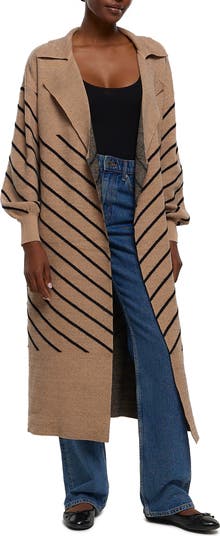 Diagonal stripes create a gorgeous chevron pattern within this oversized open-front cardigan.