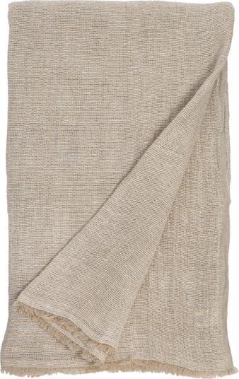 Hand loomed with an open-weave texture, this oversized throw blanket is made of breathable linen and features frayed edges.