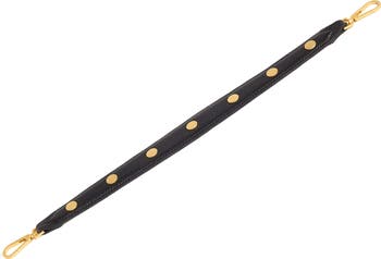 Signature rivets saunter along a rich leather strap framed by a pair of dogleash clips for easy attachment to your favorite bags.