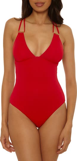 Soak up the sun in this textured swimsuit that comes in a fiery hue with glinting hardware and a seersucker design for stunning dimension.