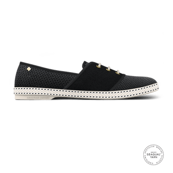 Moccasin in Cotton Canvas and Seaqual* Mesh Features: Cotton canvas and Seaqual* mesh Gold-plated metal rivet Cotton bias Ease elastics Removable leather insole Saddle-stitch cotton band around sole PVC sole Made in Spain Composition: Upper: 100% polyester mesh Insole: 100% cork Outsole: 100% PVC