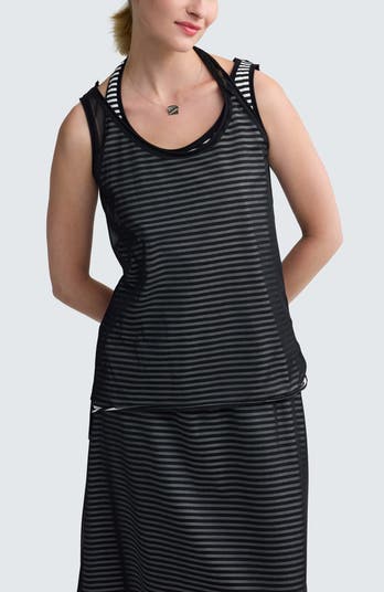 Modern mixed-media top in thin striped cotton jersey and sheer mesh. Features a sleeveless rectangular silhouette and crewneck for a graphic, breathable look.