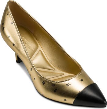 A contrasting cap toe provides a picture perfect finish for this classic pump featuring a playful logo pattern.