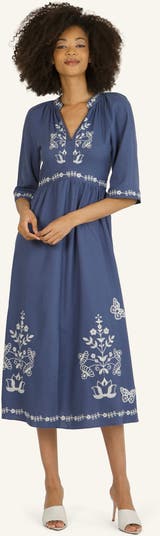 Super Natural by Secret Mission’s Roam Dress is crafted from a medium-weight linen-blend fabric that offers a breathable feel with a soft, natural drape. Designed with contrast embroidery throughout, the silhouette features a split neckline for an easy, relaxed finish. Three-quarter sleeves and a softly gathered elastic waist create a comfortable, defined shape, while the flowing maxi skirt adds graceful movement. Thoughtfully placed embroidery along the bodice, sleeves, and hem lends a refined, artisanal touch to this effortlessly versatile piece.