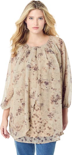 - Add a dose of flounce to your outfit with this irresistible double-layered top featuring a chiffon overlay. Cut in a figure-flattering A-line silhouette, this top features three-quarter length blouson sleeves with an elastic cuff. 32" lengthPoly crinkle chiffonMachine washImported