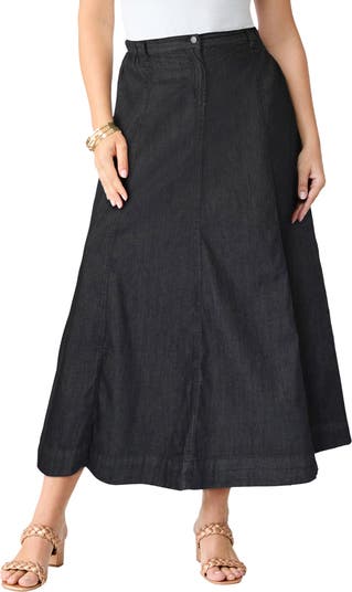 This effortlessly chic denim skirt is the perfect style to take you from workday to weekend. Its full-body A-line silhouette looks great with both simple T-shirts and tailored blouses alike. Made from 100% cotton and designed with a back yoke, classic jean styling and a high-rise waistband with elastic insets in back. Button and zip front.