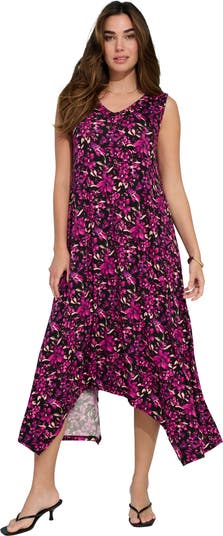 This is the dress you'll wear again and again. The swingy silhouette is everyone's favorite and this style gets a special handkerchief hem for a fun touch and added interest. Sleeveless, with a deep V-neck, it's an easy, pull-on-and-go look in a stretch knit that flows.