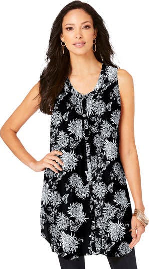 Keep your cool with this sleeveless, alluring crinkle crepe top. Scoopneck with shirring detail. Button front.
