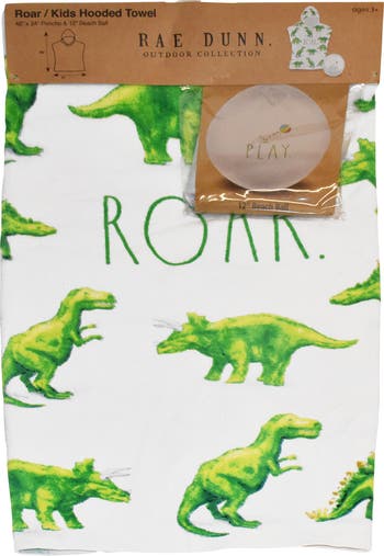 - KIDS HOODED PONCHO AND BEACH BALL COMBO - Set includes 1 Kids Hooded Poncho Towel featuring Rae Dunn artwork, and 1 colorful 12" Beach Ball!.