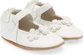 Die-cut flowers dance along the top of mary jane–style crib shoes made from smooth leather.