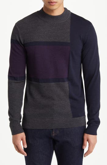 A contemporary mock-neck sweater of extrafine merino wool juxtaposes heathery hues in a geometric grid.