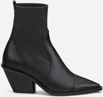 A stretch nappa ankle boot inspired by cowboy boots, featuring a stretch shaft with a soft, snug fit that immediately gives this creation an ultra-feminine look. The leather heel ensures a comfortable, lifted posture.