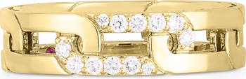 Chain-inspired cutouts lined in pavé diamonds bring intrigue to the silhouette of this 18-karat-gold band ring.