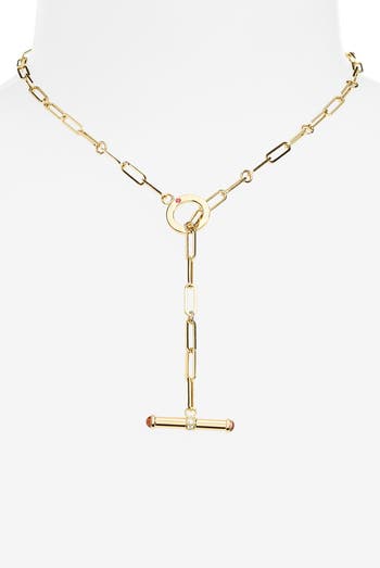 This modern lariat necklace in 18-karat gold features a ruby-dotted open circle and a bar pendant aglow with diamond pavé.