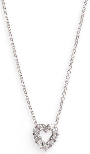A delicate white-gold chain holds a tiny diamond pendant, detailed with a signature Roberto Coin ruby hidden in back.