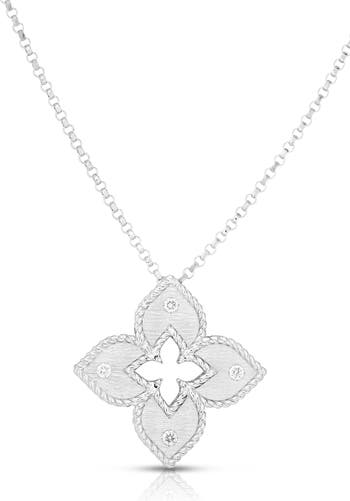 Timelessly elegant, this delicate necklace of 18-karat gold features a floral pendant sparkling with twinkling diamonds.