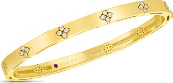 An array of shimmering diamond sunbursts shine on this 18-karat gold bangle bracelet, making it a stunning gift for yourself or a special someone.