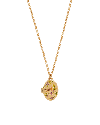 Inspired by the wandering heroine in our seasonal tale, this golden locket captures a quiet moment between bird and berry, where stories take root. Crafted in 22ct worn gold-plated brass with intricate enamel detailing, the hand-painted robin signifies resilience and is a nod to the changing seasons. Perfect for keeping your most precious memories close to your heart.
