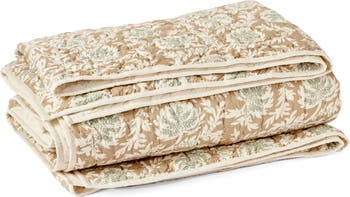 Hand-stitched waves add soft texture to an organic-cotton quilt in a soothing botanical pattern.