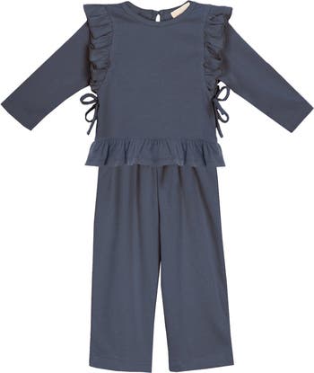 The Robyn two-piece set in deep navy features a cotton-blend peplum top with ruffle trim, adjustable knot ties, crewneck and puff long sleeves with rolled cuffs and a shirttail hem, paired with matching pants for comfortable everyday wear.