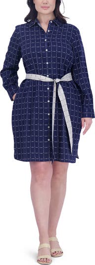 A dotted windowpane check elevates a long-sleeve shirtdress fashioned with convenient pockets and a waist-cinching tie belt.