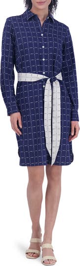 A dotted windowpane check elevates a long-sleeve shirtdress fashioned with convenient pockets and a waist-cinching tie belt.