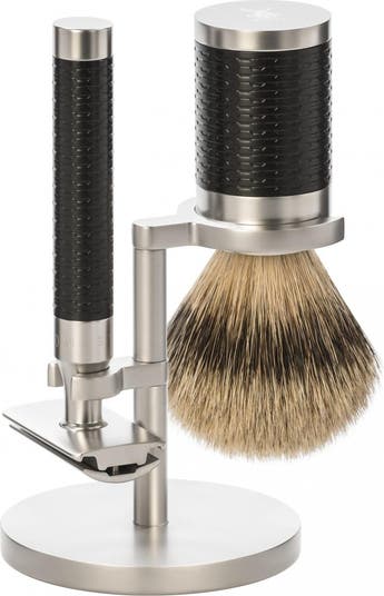 Description:3-piece shaving set, handles made of stainless steel with black Shaving brush with silvertip badger, replaceable head Ring size M: 21 mm safety razor stand made of stainless steel The ROCCA seriesBeautifully simple, yet particularly masculine: This is the new ROCCA range of products. A little more modern, and more distinctive than much of what is known from MÜHLE, they are made from the finest and most durable stainless steel. But it has been worth the effort: These products are particularly durable and robust. The satin or slightly matt finish not only feels good in your hand, but is also pleasing to the eye and creates an elegant effect.Even with all of these new details, ROCCA's heritage is still very evident. The design of this range is a further development of classic MÜHLE models; the name ROCCA (from the Italian for castle or fort) refers to the very best materials – and also to the fact that a MÜHLE product will last a lifetime and beyond.The Brushhead - Silvertip badgerAmong connoisseurs, silvertip badger is regarded as the pièce de résistance: Only the best, carefully selected badger hair is used for these purely handcrafted shaving brushes. The precious natural material is particularly soft and flexible.The fine, conically tapering hairs possess the ability to retain a large amount of water and produce a dense, creamy lather. Another sign of quality is the even black band running horizontally through the predominantly silvery gleaming hair.This premium product is manufactured using historical tools in an artisan procedure mastered by only a few specialists worldwide. The semi-circular shape of the brush head is created by hand when binding the brush. The fine tips therefore do not require trimming and the natural softness of the hair is retained.The brush heads are manufactured from the finest quality and are easily interchangeable via the fine integrated screw-thread.