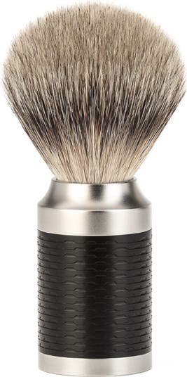 Shaving brush with silvertip badger with replaceable brush head Ring size M: 21 mm Handle made of stainless steel with matte-black structure The ROCCA series - Beautifully simple, yet particularly masculineModern, distinctive and made from the finest and most durable and robust stainless steel. The satin finish not only feels good in your hand, but is also pleasing to the eye and creates an elegant effect.Although a relatively new Series from MÜHLE, ROCCA's heritage is still very evident. The design of this range is a further development of classic MÜHLE models; the name ROCCA (from the Italian for castle or fort) refers to the very best materials that will last a lifetime and beyond. The Brushhead - Silvertip badger Only the best, carefully selected badger hair is used for these purely handcrafted shaving brushes. The precious natural material is particularly soft and flexible. The fine, conically tapering hairs possess the ability to retain a large amount of water and produce a dense, creamy lather. Another sign of quality is the even black band running horizontally through the predominantly silvery gleaming hair.This premium product is manufactured using historical tools in an artisan procedure mastered by only a few specialists worldwide. The semi-circular shape of the brush head is created by hand when binding the brush. The fine tips therefore do not require trimming and the natural softness of the hair is retained. Measures Handle: 57 mm x 32 mm Weight: 120 g