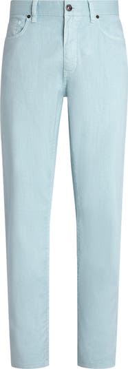 A linen-cotton blend woven with a hint of stretch keeps you moving comfortably in five-pocket jeans cut with a modern slim leg.