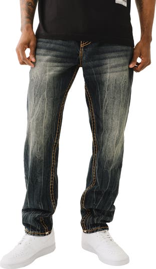 Horseshoe stitching at the back pockets adds signature True Religion style to relaxed-fit skinny jeans cut from well-faded nonstretch denim.