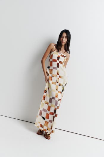 A column dress with a straight neckline, rouleau straps, and invisible back zip. Features an internal bustier with boning and hook-and-eye closure for support. Artwork in collaboration with Phoebe Willis.