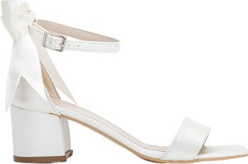 Featuring an elegant open-toe front, a secure ankle strap and a back bow from satin ribbon, these ivory bridal sandals seamlessly combine sophistication with a touch of romance. The 2.1-inch (approximately 5.5 cm) block heel sandals add stature, exuding a regal poise for your grand entrance. The shoes showcase a graceful tied ribbon detail visible at the back. Handcrafted with care and passion from luxurious ivory vegan leather and satin ribbon you can embrace your wedding day in comfort and style. These wedding sandals are here to witness and support every step of your journey. Whether you're looking for bridal shoes, wedding block heels, ribbon wedding heels, wedding flats or a pair of ivory bridal pumps these bridal flats are sure to make you look and feel your best.