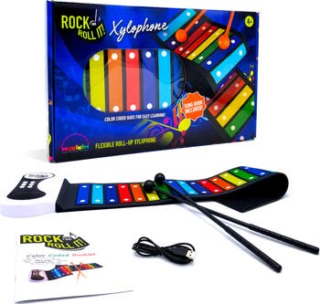 Rock and Roll It – Rainbow Xylophone is an electronic percussion pad that is flexible, portable, and easily to travel with. Rainbow color coded bars & song booklet allow you to learn and play songs so easily! * Powered by USB (cord included) or Battery (AAA batteries X4). Easily to rock out and roll it back and put it in your bag or in the box after playing. * Unique pad design mimics real xylophone. Color coded bars, song booklet and tutorial functions allow you to learn and play songs easily and fast * 7 realistic instrument sound styles (xylophone, tubular bells, celesta, glockenspiel, music box, vibraphone, and marimba) + multiple demo songs that you can play the xylophone pad in multiple ways * Multiple functions include built-in speaker, audio output, record/playback, and volume control keys. Allow you to connect the audio output to your headphone or external speaker * The standard electronic xylophone set allows beginners to masters, kids and adults to enjoy the bight and brittle sounds by striking the pad with mallets and playing with your favorite music The Box Includes: * Rainbow Xylophone 1X * Mallet 2X * Color Coded Song Booklet 1X * USB Power Cord 1X * User Manual 1X Note: * The xylophone will enter sleep mode when there is no playing for 3 minute. Press the key to wake it up * Do not use near strong radio waves * Roll it up loosely. Rolling it too tightly could damage the inner connections * Rechargeable batteries are only to be charged under adult supervision * Recommended Ages: 4+