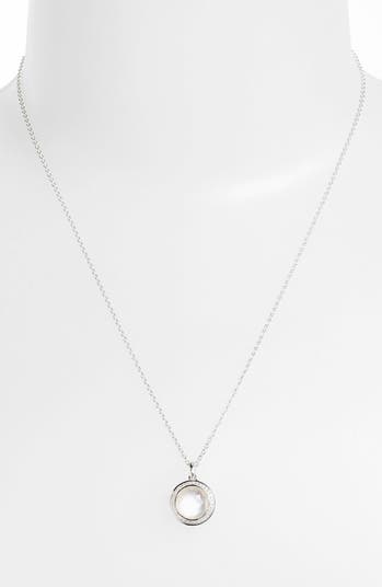 A glimmering diamond-rimmed bezel houses the round-cut semiprecious stone ornamenting this sterling-silver necklace.