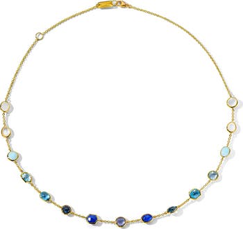Bezel-set semiprecious stones offer vibrant pops of ocean-blue color along this 18-karat-gold necklace.